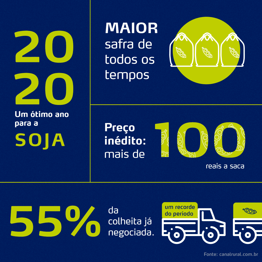 O setor da soja viveu um dos momentos mais espetaculares de sua história, apesar do ano diferente e desafiador. Além de colher a maior safra de todos os tempos e, de quebra, se tornar o maior produtor mundial do grão, os produtores viram os preços da saca atingirem patamares inéditos. A cultura, que há muito tempo já é a principal cultura agrícola do país, se coloca - cada vez mais - na liderança mundial, não só na exportação, mas também na produção. Diversos fatores favoráveis, como demanda e câmbio, possibilitaram a celebração de alguns recordes, tanto em oferta como em valores.