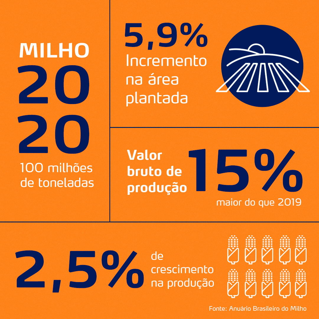 O setor produtivo do milho comemorou a marca de 100 milhões de toneladas, na etapa 2019/2020, e considera que o avanço pode ser ainda maior, devido à boa demanda. De acordo com o Ministério da Agricultura, Pecuária e Abastecimento, o milho é hoje a segunda cultura agrícola com maior Valor Bruto de Produção (VBP), com R$ 81,9 bilhões, 15% a mais do que em 2019. A fase está sendo considerada excepcional, em que se celebra a valorização do grão, a passagem da produção do patamar de 100 milhões de toneladas e sua maior participação nas exportações. Hoje, o Brasil produz até três safras por ano e mostra disposição de continuar evoluindo para atender a crescente demanda.