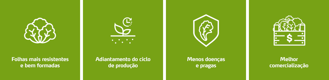O Programa Nutricional para Folhosas possui um fertilizante recomendado para cada etapa do ciclo das culturas.
