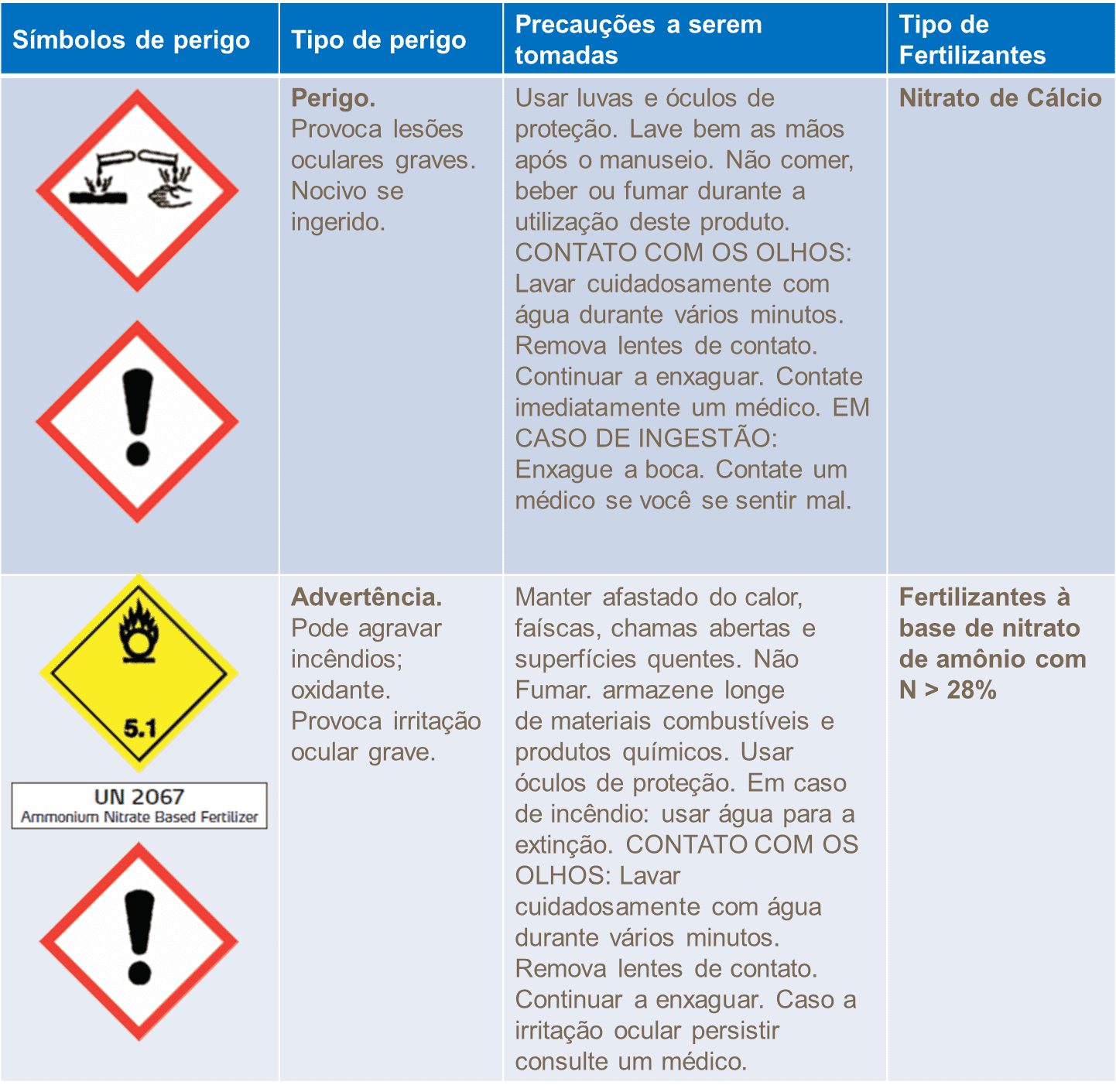 Você encontrará informações importantes para o transporte, o armazenamento e o manuseio impressas no rótulo do saco do fertilizante. A classificação do produto e a rotulagem está em conformidade com as legislações nacionais e o regulamento da UE, e a classificação do transporte está de acordo com os Regulamentos-Padrão para o Transporte de Produtos Perigosos (TDG) da ONU. A composição química do produto está especificada no saco e está de acordo com o regulamento nacional de cada país. Os escritórios locais de vendas podem fornecer mais informações e assistência.